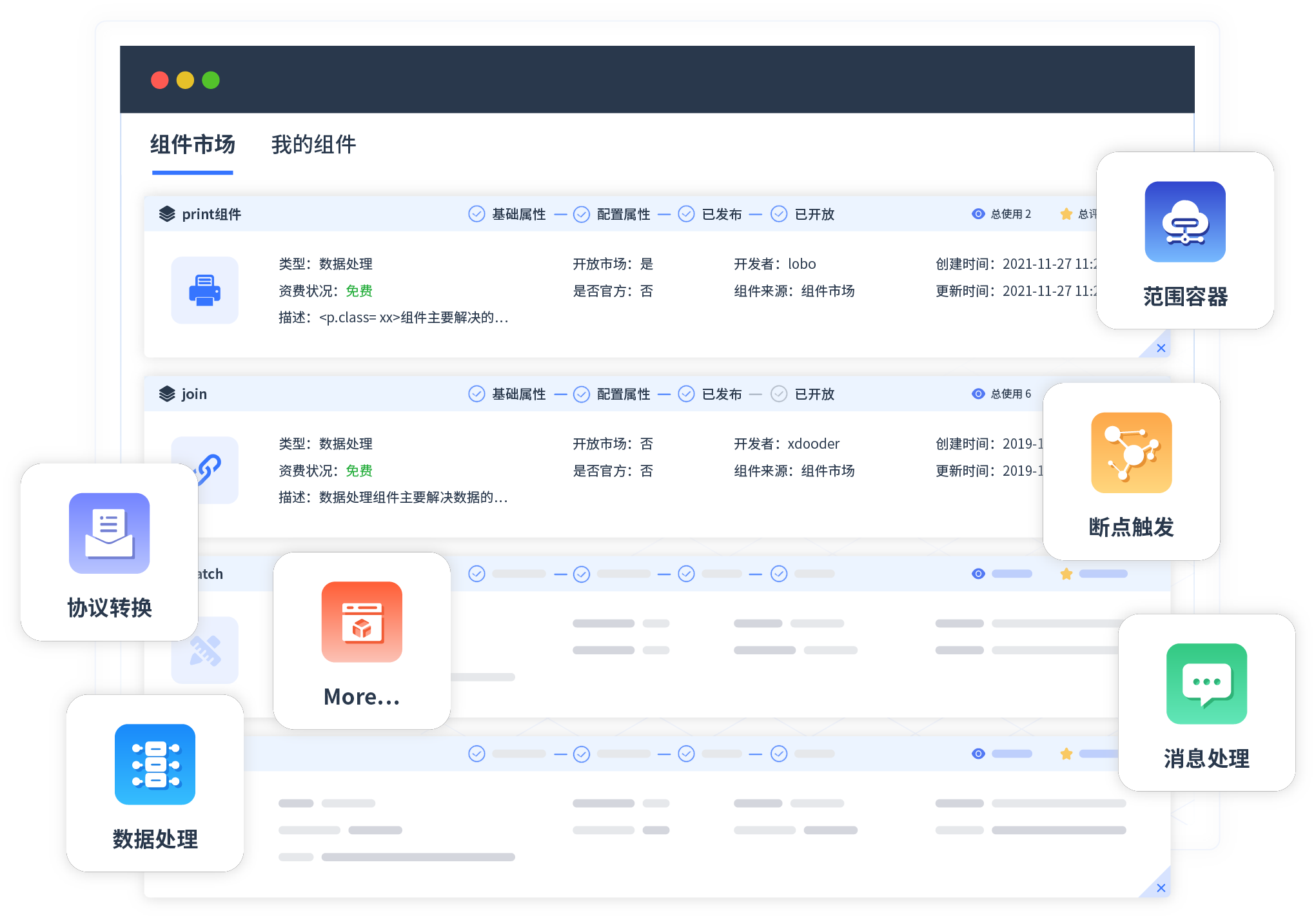 针对集成场景,,,圆梦钱包提供组件市场,,,例如协议转换、、消息处理、、文件操作等。。。。除平台提供的组件外,,,客户可以自定义所需组件。。。