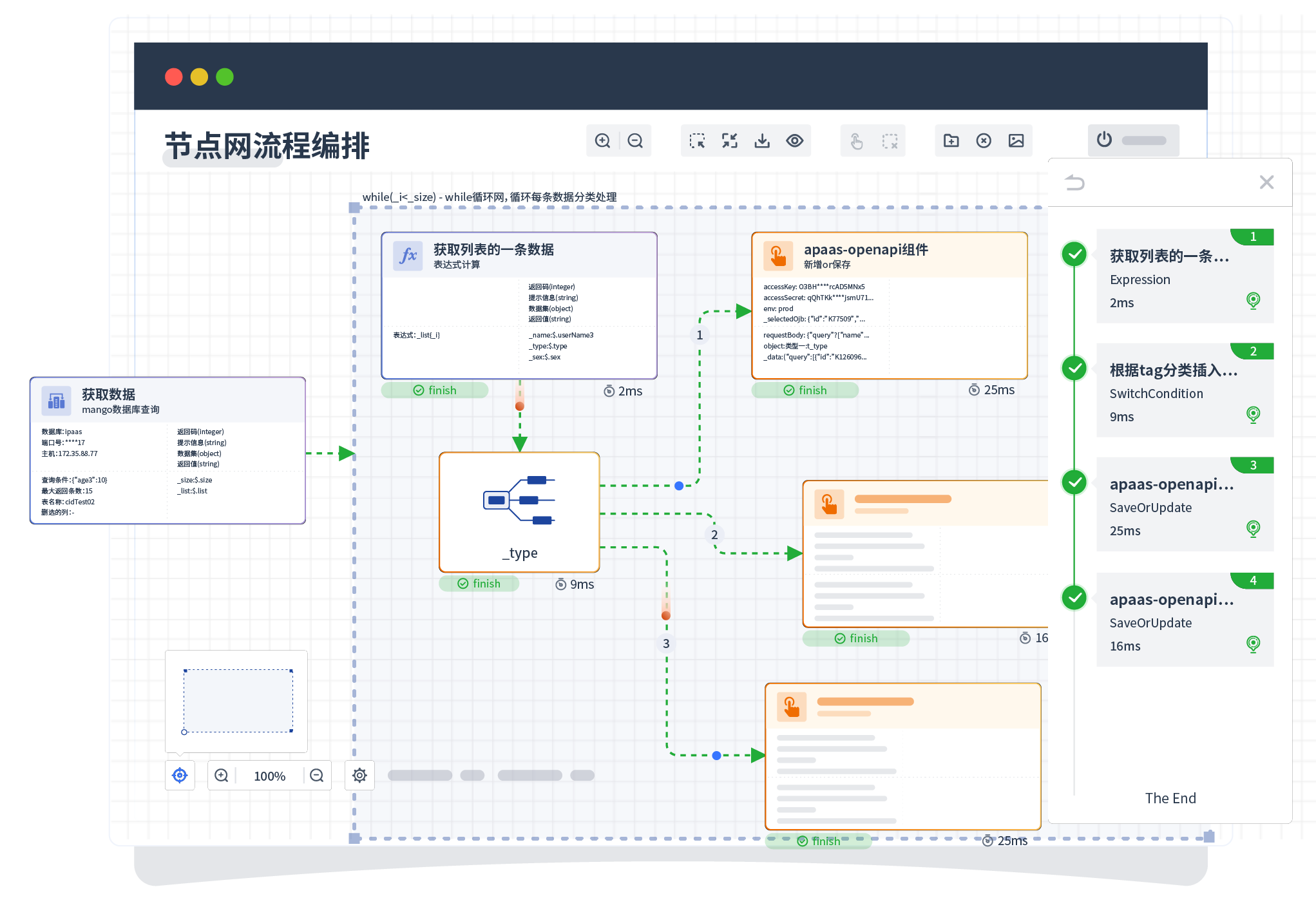 针对集成场景,,,,组件定义后支持进行流程编制,,,,不同于传统代码方式,,,,通过图形化展示,,,支持在线调试、、、日志查看和运行回放。。