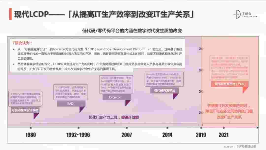 2020年前后,,,,源于提高IT工作者开发效能的LCDP不断进化和衍生,,面对业务导向日益明显的数字化变革。。。LCDP衍生出了面向不同对象的升级服务——面向专业人群的LCDP和业务人群的NCDP,,,,LCDP与NCDP的不同服务属性被逐渐认可和接受。。 LCDP在提高IT开发效率的同时,,降低IT与业务之间协同的门槛改变IT生产关系。。。